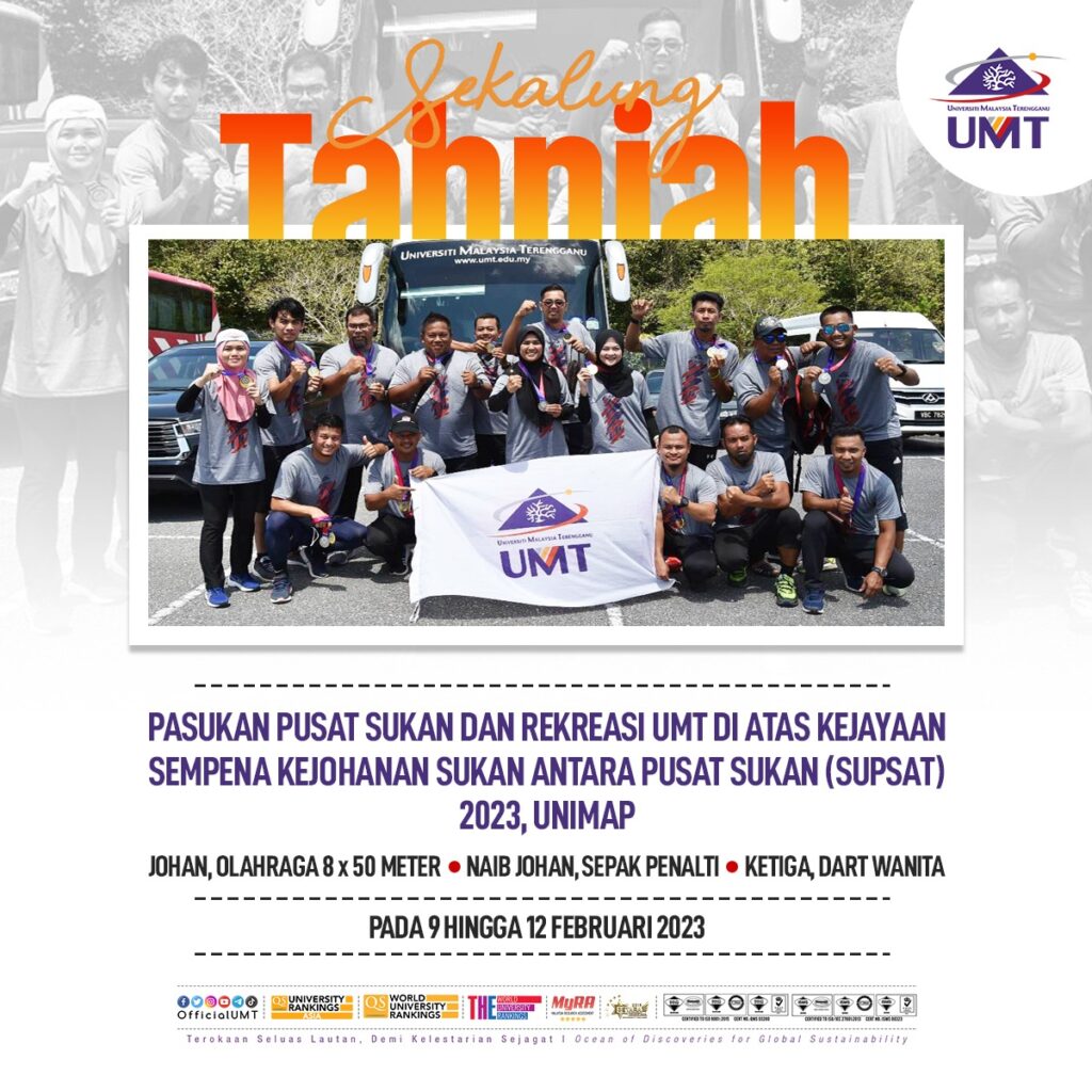 Beraksi hebat di Kejohanan Sukan Antara Pusat Sukan (SUPSAT) 2023 yang telah berlangsung pada 9 hingga 12 Februari 2023 bertempat di UniMAP menyaksikan Pasukan Pusat Sukan dan Rekreasi UMT berjaya membawa pulang kejayaan dengan merangkul 1 Pingat Emas bagi acara Olahraga 8 x 50meter, 1 Pingat Perak bagi acara Sepak Penalti dan 1 Pingat Gangsa bagi acara […]