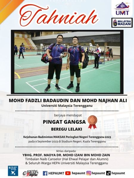 Pasukan Badminton UMT masih mampu mencabar dan menunjukkan kecemerlangan di Kejohanan Badminton Maksak Peringkat Negeri Terengganu yang diadakan pada 9 September 2023 di Stadium Negeri Kuala Terengganu. Pasukan Badminton UMT berjaya membawa pulang 3 pingat gangsa melalui acara bergu lelaki, bergu wanita dan perseorangan wanita. En.Mohd Fadzli bin Badaudin juga dipilih sebagai jurulatih pasukan badminton