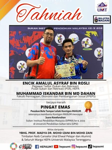 Tahniah kepada Muhammad Iskandar bin Md Dahan yang mewakili Pasukan Bola Tampar MASUM di Kejohanan Sukan Institusi Pendidikan Malaysia (SIPMA) dan berjaya meraih pingat emas dalam kejohanan tersebut. Staf PSR iaitu En.Amalul Asyraf bin Rosli juga merupakan Jurulatih bagi Pasukan Bola Tampar MASUM.