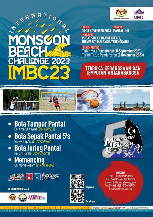 Sukacita pihak kami ingin menjemput kepada semua warga untuk sama-sama mengambil bahagian dalam INTERNATIONAL MONSOON BEACH CHALLENGE 2023 yang akan diadakan sebagaimana yang berikut : 15-18 November 2023 8am – 5pm Pantai UMT, Terengganu Acara dipertandingkan : Bola Tampar Pantai Bola Sepak Pantai 5’s Bola Jaring Pantai Hadiah Wang Tunai Keseluruhan : RM15,000.00 Acara Kemuncak
