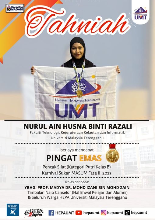 Nurul Ain Husna sekali lagi meraih pingat lagi di Kejohanan Sukan MASUM Fasa 2, 2023 di UTEM, Melaka. Pingat kali ini lebih bermakna kerana berjaya pulang pingat emas dalam acara Pencak Silat (Kategori Putri Kelas B). Tahniah diucapkan kepada beliau.