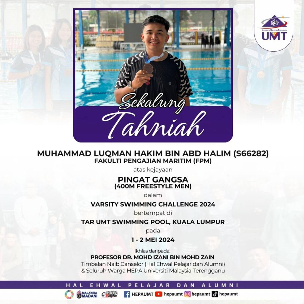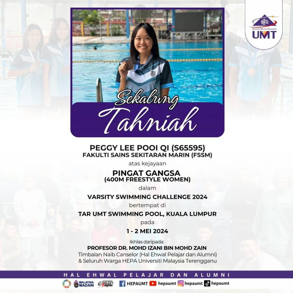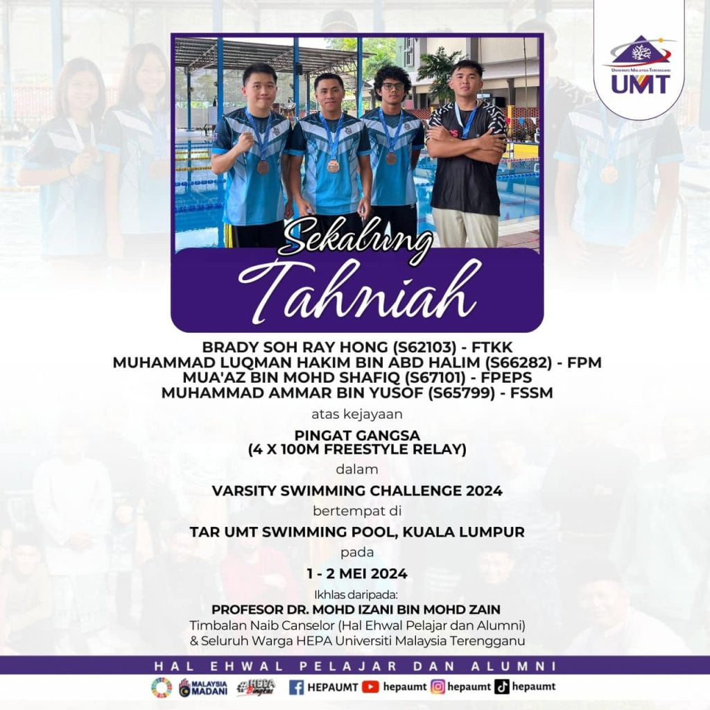 Tahniah dan syabas diucapkan kepada atlet-atlet pasukan Renang UMT atas kejayaan memenangi 4 pingat gangsa di Kejohanan “Varsity Swimming Challenge 2024” yang berlangsung selama 2 hari bermula 01 – 02 Mei 2024 di Kolam Renang TAR UMT, Setapak Kuala Lumpur.