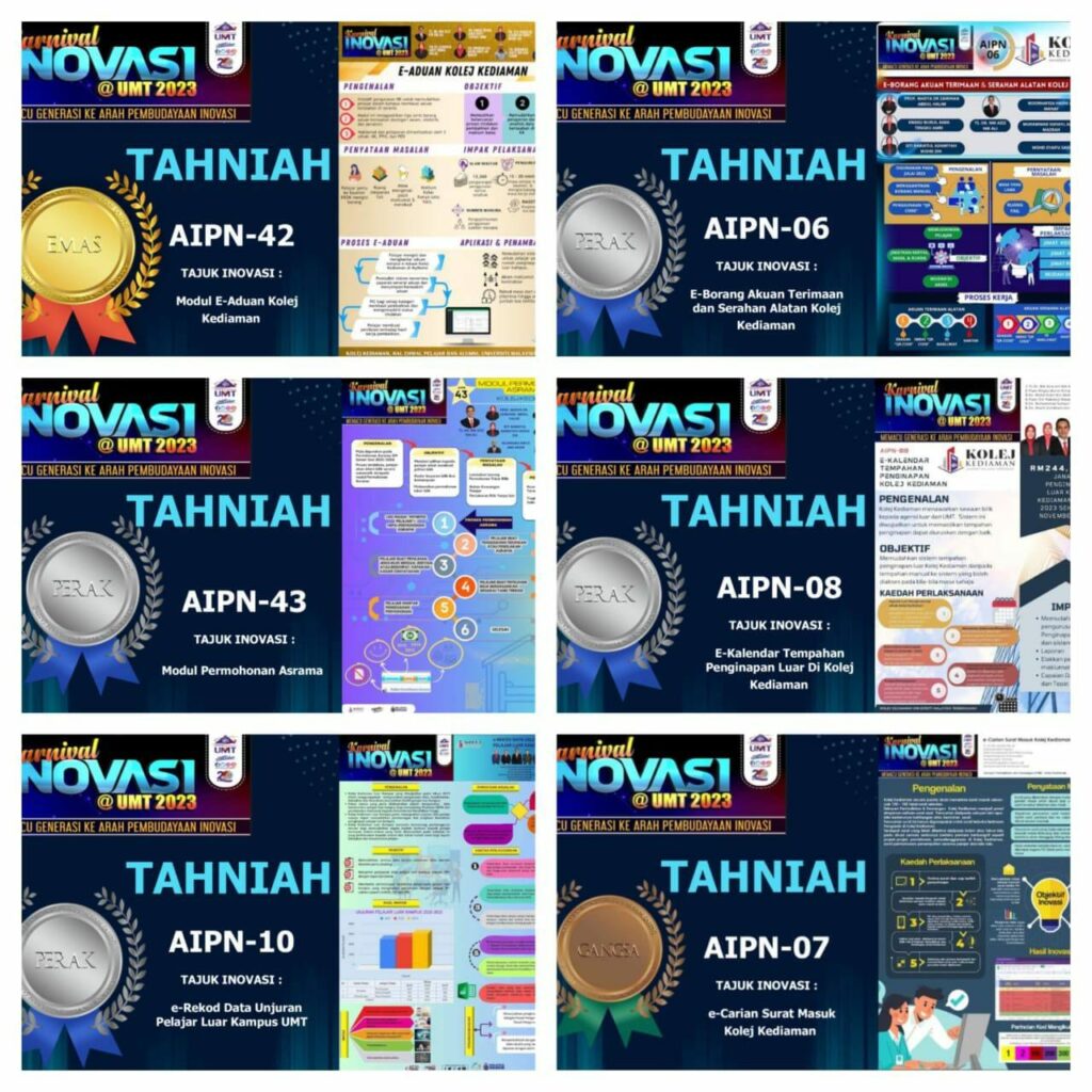 PENYERTAAN KOLEJ KEDIAMAN DI KARNIVAL INOVASI@UMT 2023 Tarikh : 22/11/23 (Selasa) Masa : 8:30 -4:00 Petang Tempat : Aplikasi Cisco Webex Perincian: Penyertaan 6 kumpulan daripada Kolej Kediaman yang telah merangkul 1 pingat emas, 4 pingat perak dan 1 pingat gangsa di Karnival Inovasi@UMT 2023. Penyertaan melibatkan inovasi amalan pengurusan masing-masing mengikut Seksyen iaitu Kolej