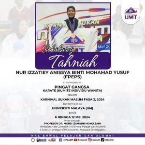 Well done & Congratulations Nur Izzatiey Anissya binti Mohamad Yusuf from the Faculty of Business, Economics and Social Development (FPEPS) for winning the Karate BRONZE MEDAL (Women's Individual Kumite)