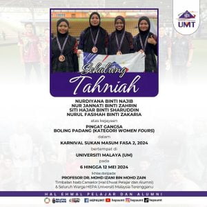 Kejohanan MLBB Challenge UMT akan diadakan pada 6 hingga 7 Disember 2024 dari jam 8 pagi hingg 6 petang bertempat di Dewan Serbaguna, Kompleks Sukan
