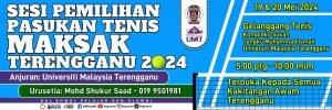 MAKSAK Terengganu will hold the 2024 MAKSAK Terengganu Tennis Team Selection Session under the management of the Sports And Recreation Center, Universiti Malaysia Terengganu as per the following regulations:- Date