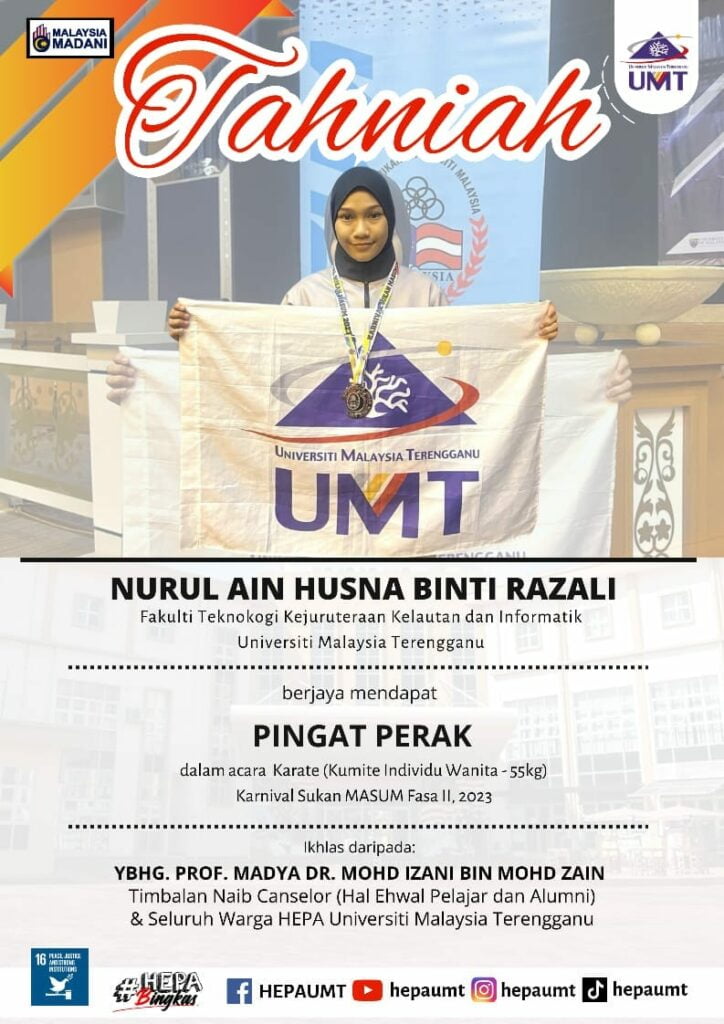 Congratulations to the UMT Karate Team who successfully contributed 1 silver medal in the 55kg Women's Individual Kumite event and 1 bronze medal in the Women's Team Kumite event at the MASUM Sports Carnival Championship Phase 2, 2023 at UTEM Melaka.