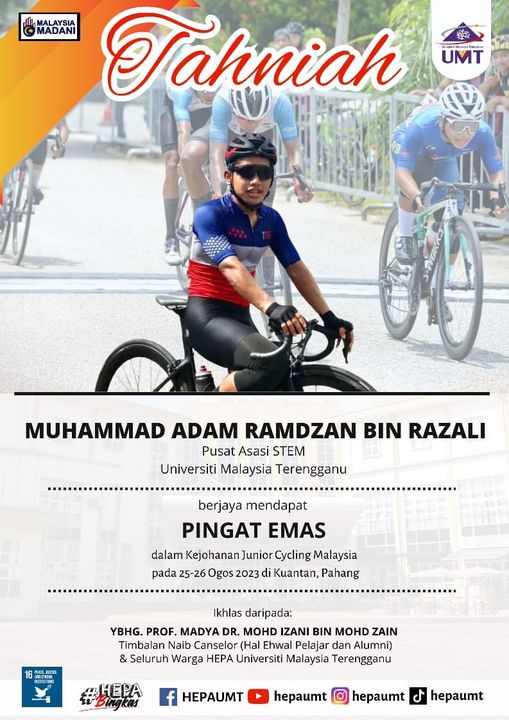 Congratulations to Muhammad Adam Ramdzan bin Razali, UMT's new cycling gem for winning Gold in the Malaysian Junior Cycling Championship last August 25-26, 2023 in Kuantan, Pahang.