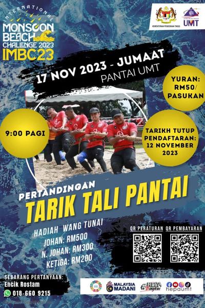 Pusat Sukan dan Rekreasi, UMT menjemput seluruh warga Terengganu untuk mengambil bahagian dalam PERTANDINGAN TARIK TALI PANTAI DAN MEMANCING yang akan diadakan sebagaimana yang berikut :