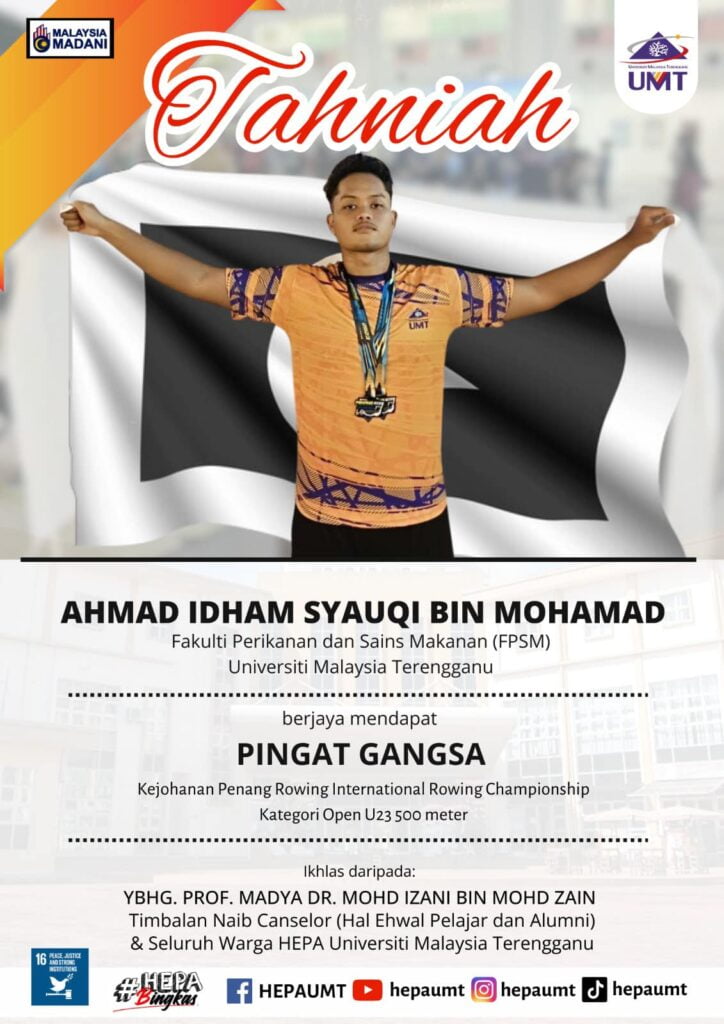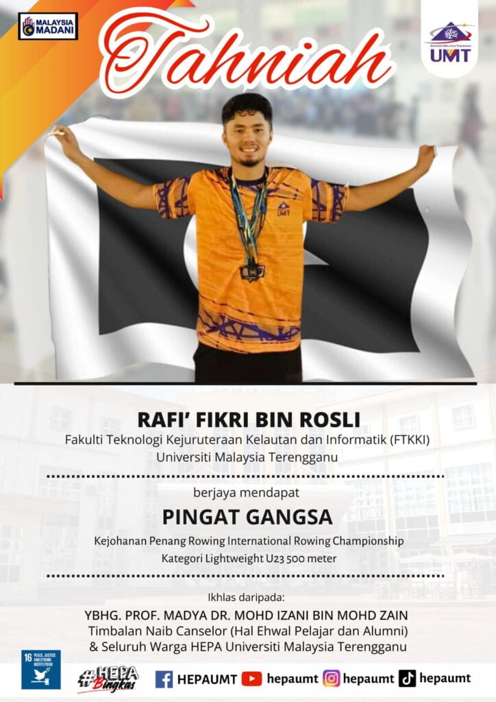 Tahniah kepada Atlet Rowing UMT yang memenangi pingat Perak dan Gangsa dalam Kejohanan Penang Rowing International Rowing Championship Kategori: Lightweight U23 500 meter dan Open U23 500 meter.