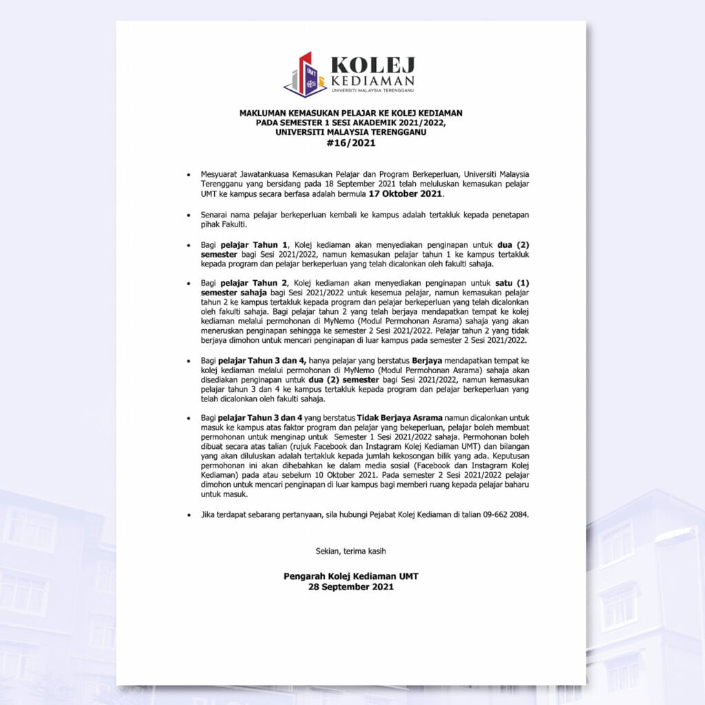 MAKLUMAN KEMASUKAN PELAJAR KE KOLEJ KEDIAMAN PADA SEMESTER 1 SESI AKADEMIK 2021/2022 / Kolej Kediaman / Oleh adminrc Makluman Kemasukan Pelajar Ke Kolej Kediaman Pada Semester 1 Sesi Akademik 2021/2022, Universiti Malaysia Terengganu. Terima kasih.#HEPAdihatiku#KKcaknasiswa
