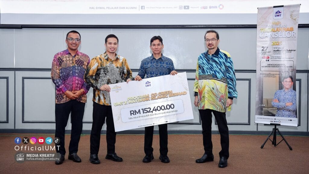 Selain itu, bagi mengintegrasikan prinsip ESG atau Alam Sekitar, Sosial dan Tadbir Urus dalam kehidupan kampus, turut diadakan penyerahan cek cura bagi pelaksanaan Program Go-Green Maybank Islamic Berhad kepada Pejabat Hal Ehwal Pelajar, UMT daripada Pusat Ihsan UMT dengan nilai sumbangan RM 152,400.00 untuk menjayakan kempen kelestarian alam.