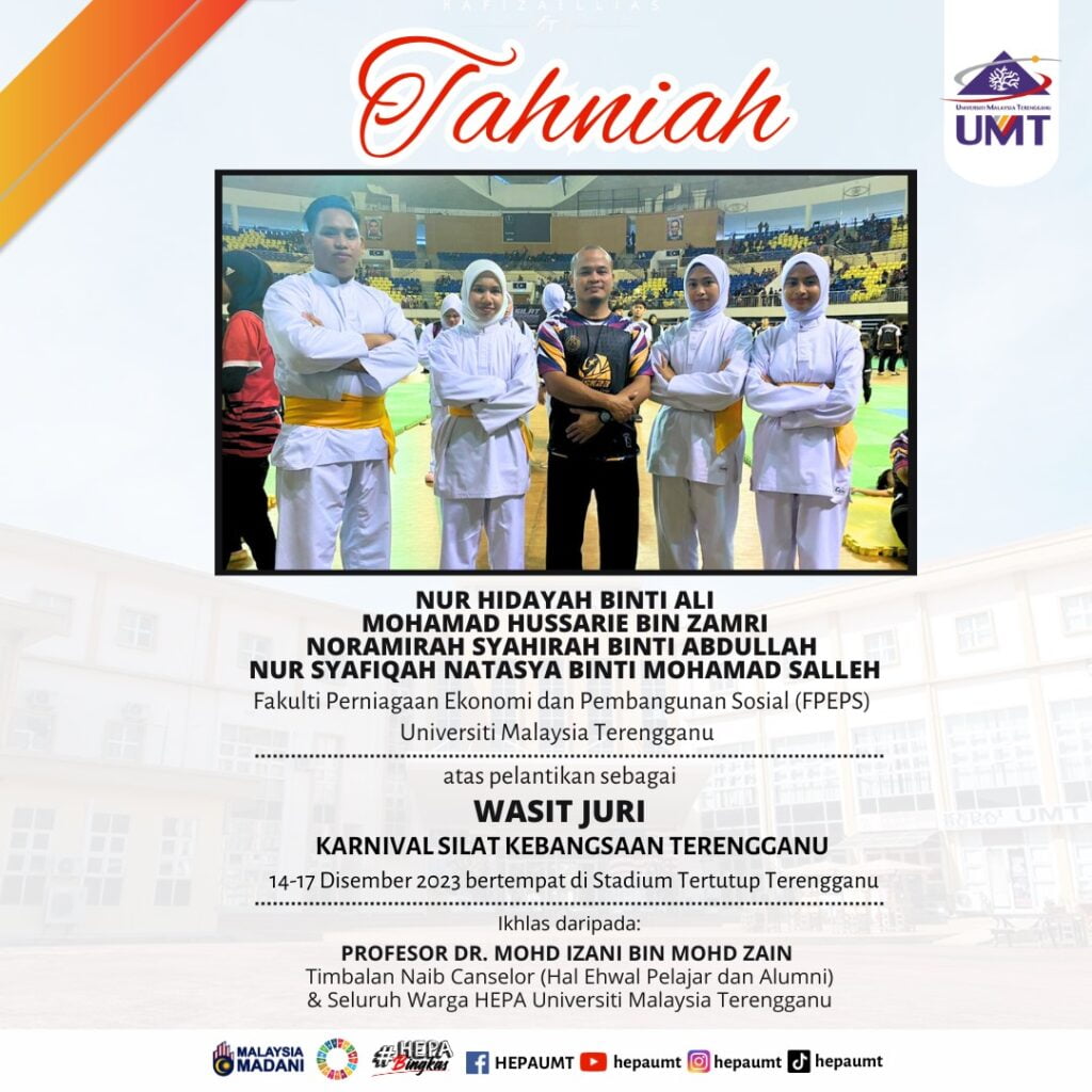 Rentetan dari kursus wasit tersebut, 4 orang mahasiswa UMT iaitu Nur Hidayah Binti Ali, Mohamad Hussairie Bin Zamri, Noramirah Syahirah Binti Abdullah dan Nur Syafiqah Natasya Binti Mohamad Salleh daripada Fakulti Perniagaan Ekonomi dan Pembangunan Sosial ( FPEPS) telah terpilih sebagai Wasit Juri Karnival Silat Kebangsaan Terengganu pada 14 hingga 17 Disember 2023 bertempat di Stadium Tertutup Negeri Terengganu, Gong Badak.