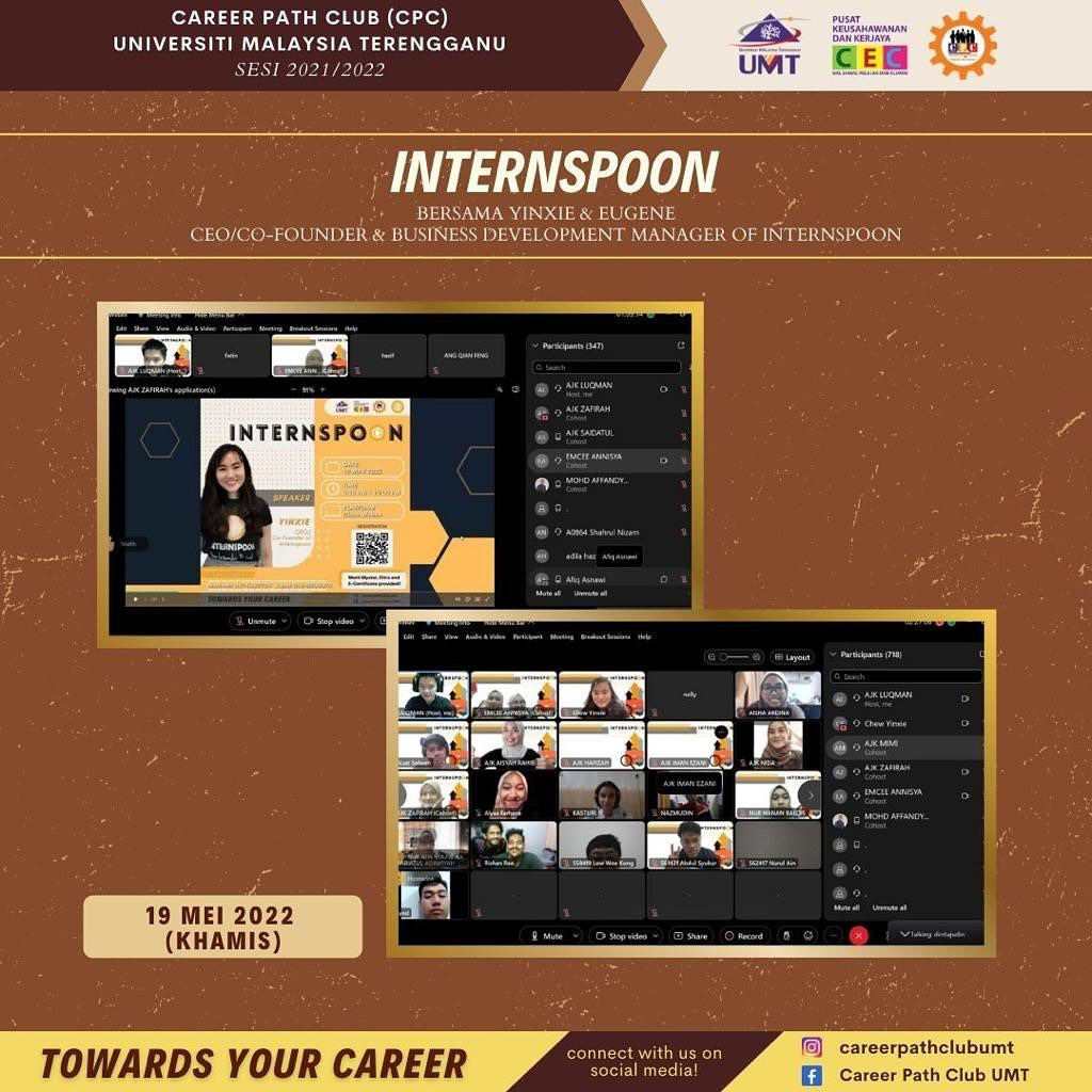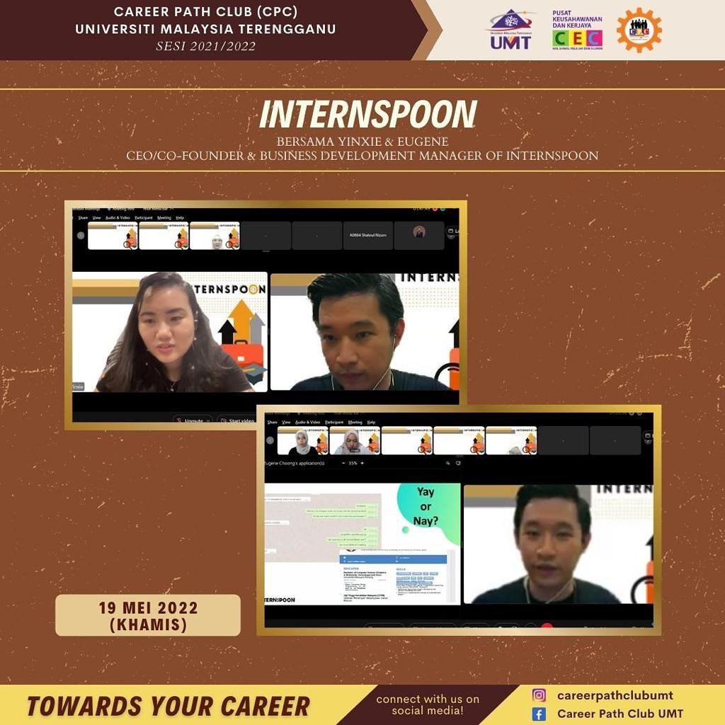 Program Internspoon yang telah berlangsung pada 19 Mei 2022 melalui aplikasi Cisco Webex. Terdapat dua (2) Panel jemputan iaitu saudari YunXie dan saudara Eugene selaku CEO/Co-Founder dan Business Development Manager, Internspoon sepanjang program berlangsung. Program ini telah memberi pelbagai pengetahuan mendalam tentang cara pemilihan tempat latihan industri dengan menggunakan platform Internspoon, secara ridak langsung dapat meningkatkan kebolehpasaran diri dan daya saing diri mereka dalam mendapatkan pekerjaan di masa akan datang.